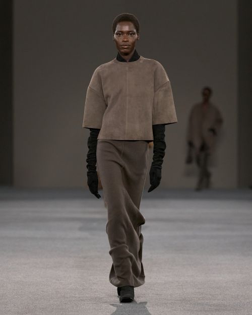 힙 라인을 따라 슬림하게 흐르는 고어 절개 디테일의 캐시미어 맥시 스커트와 중세 궁정의 소년 시종인 페이지 보이에서 영감을 받은 버터처럼 부드러운 스웨이드 소재의 튜닉, 유연하게 밀착되는 울트라 플랫 미드-싸이 부츠, 메탈 리벳을 연속적으로 장식한 디테일, 그리고 누벅 숄더 패치를 더한 코트 등 이른바 ‘암흑 시대’의 디자인은 놀라울 만큼 날카롭게 동시대적인 감각으로 표현되었다.