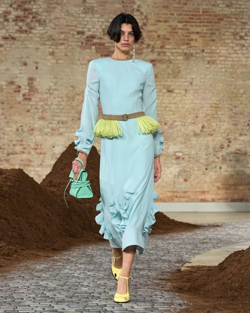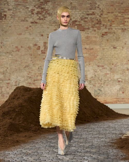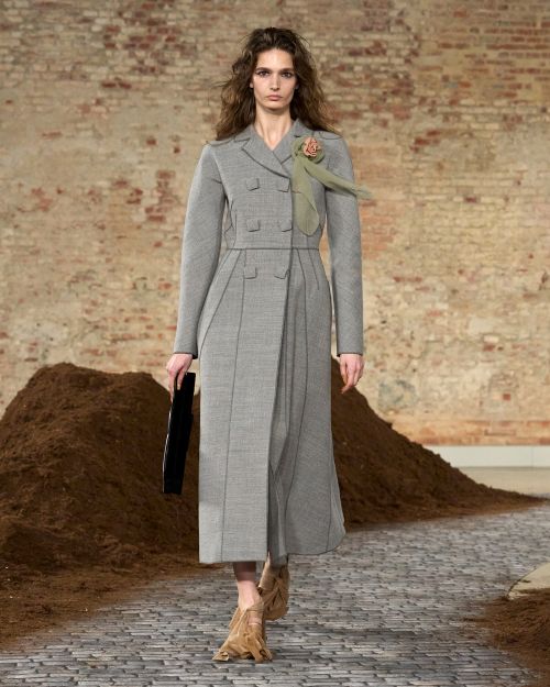 그녀의 날렵한 테일러드 드레스는 언제나 모스키노의 DNA를 특징지어 온 장인 정신과 공명하며 피날레에서 생동감을 주는 러플과 함께 기쁨의 순간을 전한다.