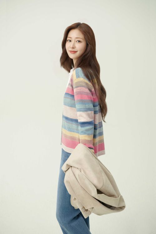 또한 라이트 베이지 컬러의 루즈핏 스웨이드 재킷에 파스텔 컬러의 스트라이프 카디건과 프릴 블라우스를 레이어드하고 데님 와이드 팬츠를 함께 매치해 감각적인 봄 레이어링 스타일을 연출했다.