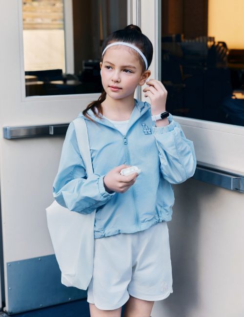 여아들을 위한 ‘스트릿 걸즈 리본 바람막이 LA다저스’는 후드와 포켓 입구에 밴딩처리로 셔링을 잡고 리본 디테일을 줘 사랑스러움을 더했다. 부드러운 터치감의 나일론 소재를 사용했으며 자수 와펜 로고와 등판 프린트 로고를 적용했다.