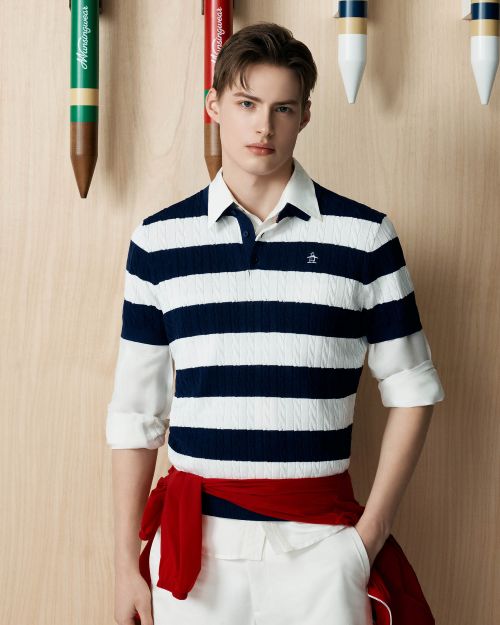 남성용 ‘케이블 반팔 스웨터’는 아메리칸 스타일에서 영감을 받은 클래식한 디자인이 특징이다. 카라형 니트 디자인에 가슴 부분의 펭귄 로고로 브랜드 아이덴티티를 강조했으며 적당한 기장감으로 슬랙스나 숏츠 등 다양한 하의와 어울린다.