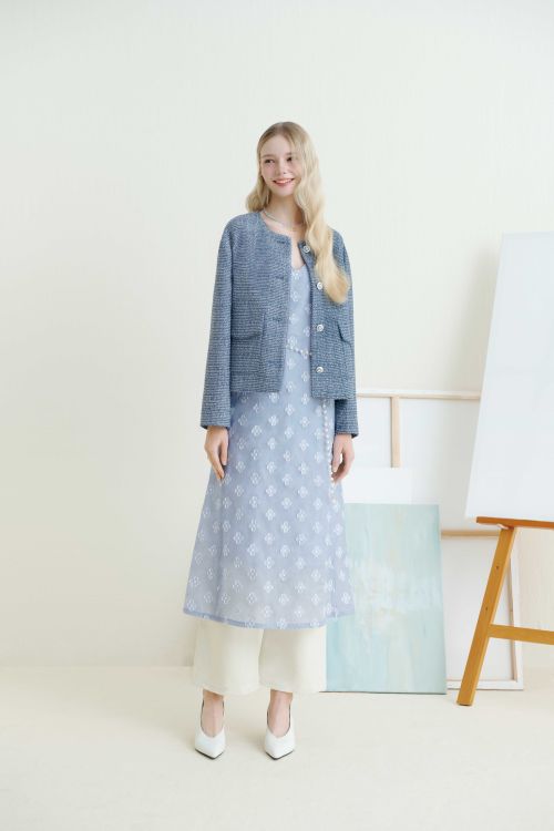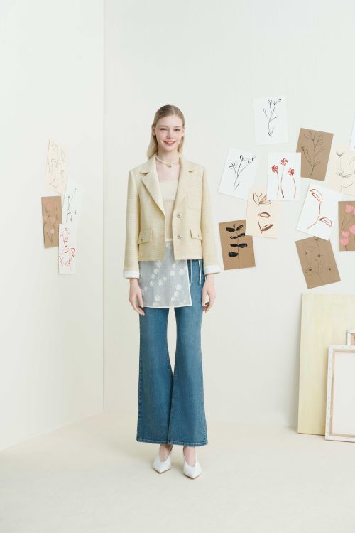 먼저 라운드넥 트위드 재킷은 산뜻한 블루 컬러에 아웃 포켓과 트리밍 디테일을 가미해 우아하면서도 페미닌한 무드를 연출할 수 있으며 화사한 옐로우 컬러의 투 버튼 싱글 트위드 재킷은 탄탄한 짜임과 군더더기 없는 베이직한 디자인으로 로맨틱한 무드의 봄 데이트룩 또는 하객룩으로 코디할 수 있다.