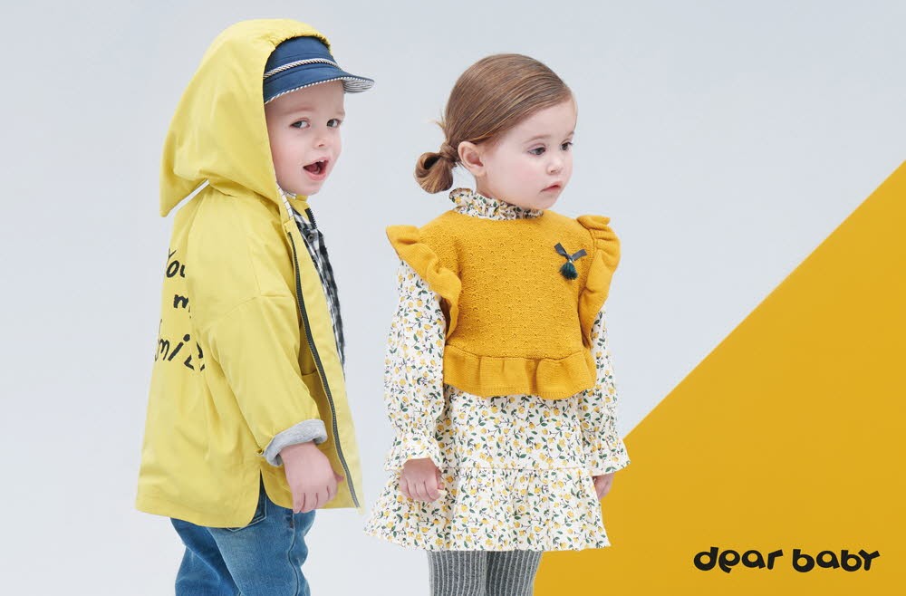 ‘디어베이비’는 화사하게 아이가 돋보일 수 있도록 옐로우 컬러가 포인트된 코디를 준비했다. 남아에게는 고깔 모양의 후드와 뒷면 로고 나염이 돋보이는 바람막이 점퍼 루이 고깔후드점퍼를 제안한다. 부드러운 면소재의 안감이 착용감을 높이고 포근함을 더한다. 여아에게는 소매와 밑단을 프릴로 연결해 발랄함을 살린 보니 니트조끼를 제안한다. 여기에 봄철 카디건과도 코디가 가능한 보니 프릴플라워원피스를 함께 매치해 사랑스러운 느낌을 전한다.