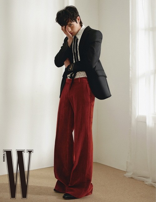 김영대 역시 오버추어 컬렉션의 트위드 카디건 재킷과 에스카톨로지 라벨 디테일이 돋보이는 블랙 울 재킷 및 벨벳 팬츠를 매치하고 한지현과 함께 웹 디테일의 롸이톤 스니커즈를 선보이며 감각적이고 세련된 스타일링과 카리스마 넘치는 눈빛으로 멋진 화보를 완성했다.