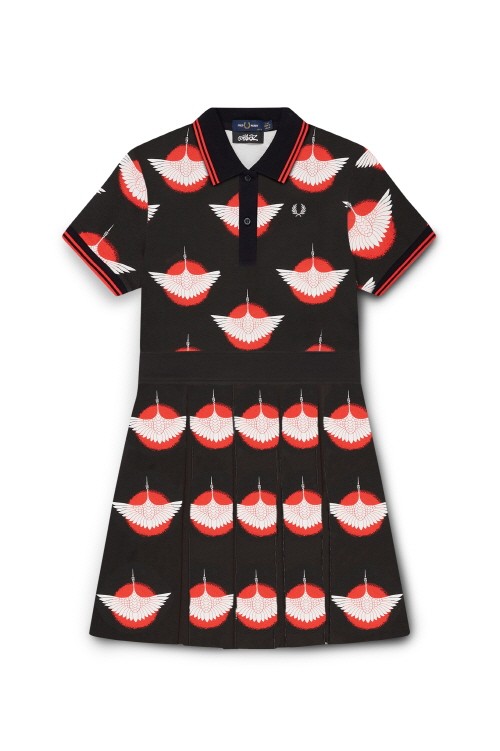 ‘프레드페리’의 시그니쳐 아이템인 폴로 스커트, 피케 드레스와 테니스 드레스에는 고릴라즈 세계관의 주요 모티프인 학으로 그래픽 프린트로 포인트를 주어 재해석한 점이 돋보인다. 트랙 재킷과 트랙 팬츠에는 또 다른 모티프인 ‘OWL’, ‘Choose Pazazu’를 자수와 프린트로 넣었고 티셔츠에는 고릴라즈 시그니쳐인 ‘Reject False Icons’ 문구를 뒷면에 새겨 디테일을 더하였다.