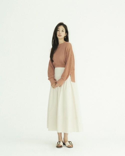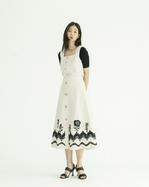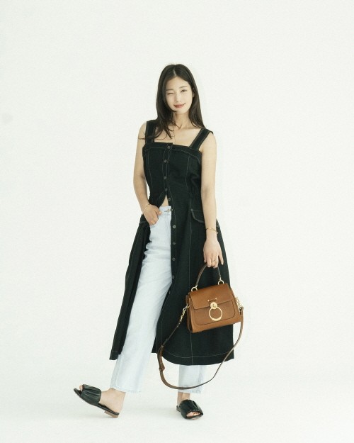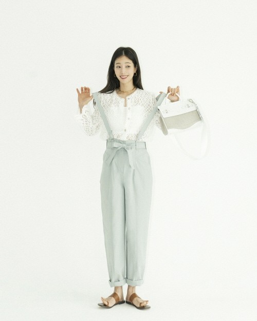 여성스러운 블라우스와 서스펜더 팬츠의 매치는 여성스러우면서도 귀여운 스타일링으로 그녀만의 러블리한 감성을 더했다. 스타일마다 여름에 활용하기 좋은 미들 힐 샌들과 슬라이드 샌들, 스트랩 샌들 등 다양한 샌들류를 선보였다.