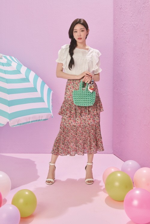 두 번째 화보에서는 프릴 소매 디자인의 화이트 반팔 블라우스와 잔잔한 플라워 쉬폰 캉캉스커트로 여성스러우면서 발랄한 룩을 선보였다.