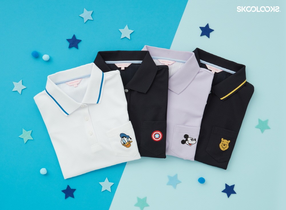 디즈니 콜라보레이션 생활티는 미키 마우스도날드덕곰돌이 푸스티치어벤져스 등 디즈니의 다양한 인기 캐릭터가 적용된 반팔 폴로 티셔츠 제품으로 사랑스럽고 통통 튀는 교복 스타일링을 연출할 수 있다.