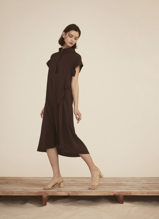 변형 카라 솔리드 원피스는 허리선을 따라 흐르는 러플 장식과 원피스 뒷부분이 길게 늘어진 비대칭 기장이 조화롭게 어우러졌다. 자연스럽게 팔을 감싸주는 소매가 매력적인 루즈핏 스타일이다.