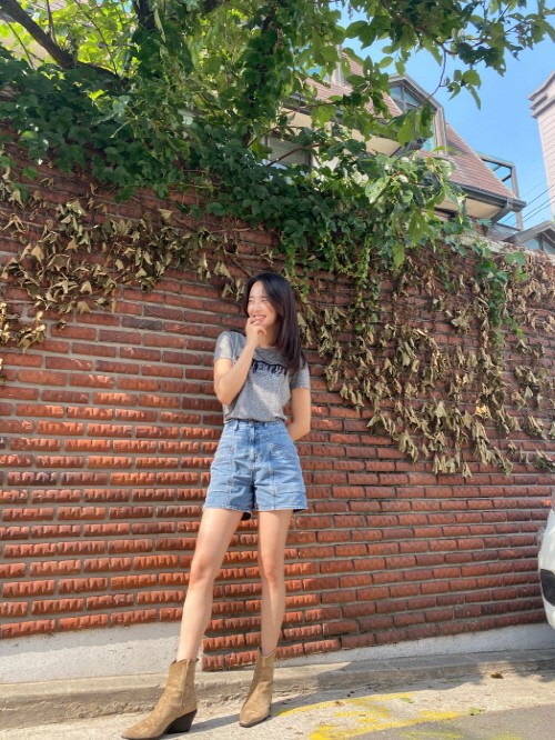 두 번째 스타일은 데님으로 된 4부 카고 쇼츠 팬츠로 적당한 두께감과 텐션이 있어 여름철 편안한 활동을 제공하며 사선의 절개 디자인을 통해 슬림한 핏을 연출하도록 도와준다. 상의로는 유광 스팽글 장식이 포인트인 버커루의 스팽클 라운드넥 티셔츠를 매치해 패션 감각을 뽐냈다.