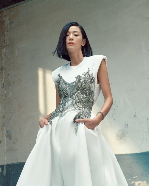 뿐만 아니라 은빛 수련 잎 자수가 길게 내려오는 화이트 저지 티셔츠에 스커트를 매치한 컷에서는 범접할 수 없는 우아한 무드를 연출했다.