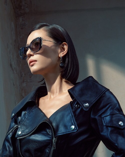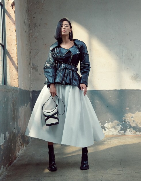 또한 오픈 네크라인이 바이커 재킷과 대비되는 풍성한 화이트 스커트에는 소프트 아이보리와 블랙 조합의 커브 백과 캣 아이 선글라스로 시크한 무드를 더했다.