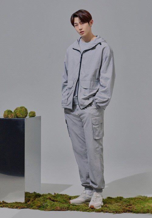 화보 속 상품인 후드형 윈드브레이커 셋업은 시티 아웃도어 트렌드를 반영한 제품으로 양방향 지퍼 등 간절기에 필요한 기능성까지 갖췄다. 캠퍼스 그래픽이 돋보이는 스웨트 셔츠 셋업은 스웨트 셔츠와 핀턱 포인트의 조거 팬츠 세트 구성으로 편안함과 스타일리시함을 동시에 잡을 수 있다.