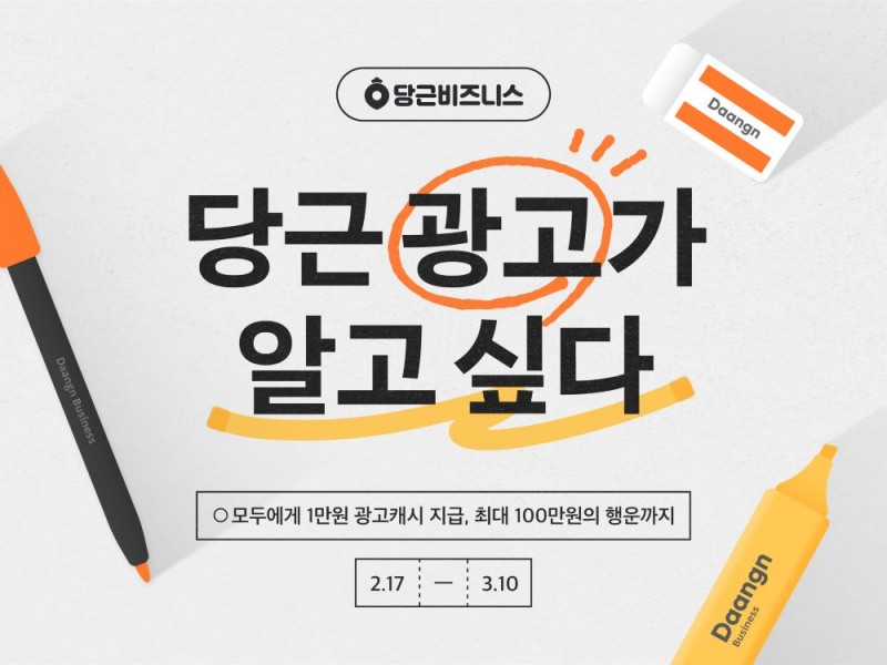당근마켓(대표 김용현 황도연)이 동네 자영업자들을 대상으로 오늘(17일)부터 오는 3월 10일까지 당근마켓 광고에 대한 5문 5답을 확인하면 광고 캐시 1만원을 증정하는 당근 광고가 알고 싶다 프로모션을 진행한다.