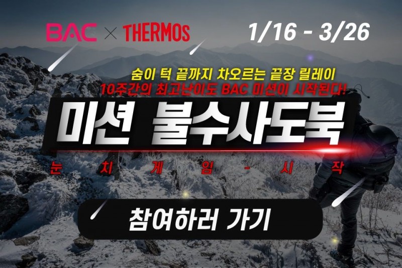 ‘써모스’와 ‘블랙야크’가 함께하는 이번 콜라보레이션은 종주 프로그램 챌린지로서 1월 16일부터 3월 26일까지 약 10주간 진행된다. BAC 종주 프로그램은 특정 기간 내에 해당 인증지를 연속으로 산행하여 GPS와 사진을 인증하는 프로그램이다. 특히 이번에 진행하는 불수사도북 종주 프로그램은 서울 강북에 위치한 5개의 산(불암산, 수락산, 사패산, 도봉산, 북한산)을 연달아 오르는 종주 코스의 완주를 목표로 한다. 불수사도북 코스는 등산을 즐겨하는 등산러 및 아웃도어족이라면 한번 즈음 필수로 도전한다는 국내 대표적인 종주 코스다. 이에 해당 종주 챌린지 이벤트는 오픈과 동시 많은 등산러들에게 관심을 받으며 현재에도 많은 참여가 이루어지고 있다.