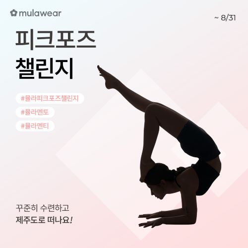 참여 방법은 #뮬라피크포즈챌린지 검색 또는 뮬라멘토를 팔로우해 수련 방법을 확인하고 이달 31일까지 개인 SNS에 스토리나 게시글로 피크포즈를 인증하면 된다. ‘뮬라웨어’는 챌린지를 독려하고 참가자를 응원하기 위해서 피크포즈를 매일 수련하고 인증한 5명을 뽑아 제주도 왕복항공권(1인 1매)을 선물한다. 더 자세한 내용은 뮬라웨어 공식 인스타그램에서 확인할 수 있다.