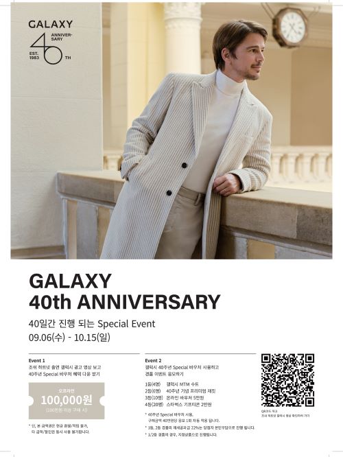 삼성물산 패션부문이 ‘갤럭시’ 론칭 40주년을 맞아 이달 6일부터 내달 15일까지 온오프라인에서 동시 진행하는 특별 프로모션을 진행한다.