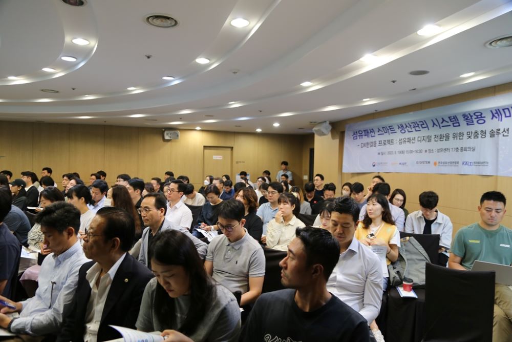 한국섬유산업연합회(회장 최병오)가 이아이시스템(대표 김태강)과 한국의류지능화연구소(소장 박준희)와 공동으로 지난 19일 섬유센터 17층에서 ‘섬유패션 스마트 생산관리 시스템 활용 세미나’를 개최, 섬유패션기업 100여명이 참석하며 성황리에 종료했다.