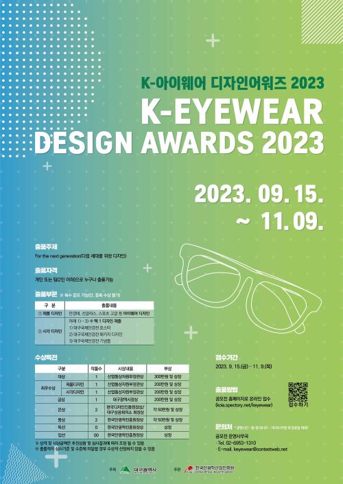 대구광역시에서 주최하고 한국안광학산업진흥원이 주관하는 ‘K-아이웨어 디자인어워즈 2023’이 9월 15일부터 11월 9일까지 출품작을 접수 받는다.