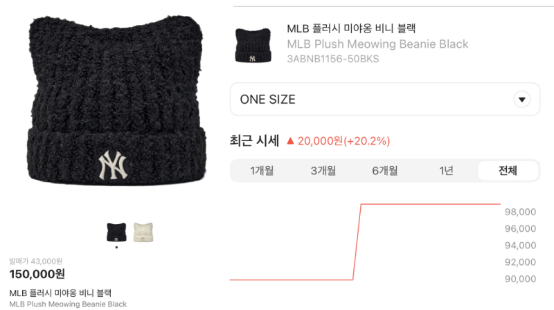 특히 블랙 컬러의 미야옹 비니는 리셀 전문 플랫폼인 크림에서 정가 43,000원 대비 약 +348% 상승한 15만원에 거래되는 폭발적인 수요를 기록하고 있으며 크림 컬러 또한 14만원을 기록하고 있다.