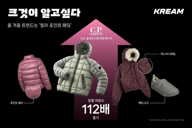 크림 관계자는 “크림이 보유한 방대한 거래 데이터를 분석한 결과 패딩 트렌드가 블랙 눕시와 같은 기본 아이템에서 자연 친화적 그래놀라 코어를 거쳐 이제는 과감한 컬러 포인트로 진화하고 있음을 확인했다”라며 “올 겨울 돋보이는 색다른 스타일을 원한다면 컬러와 텍스처가 강조된 제품에 주목해 보기를 바란다”라고 말했다.