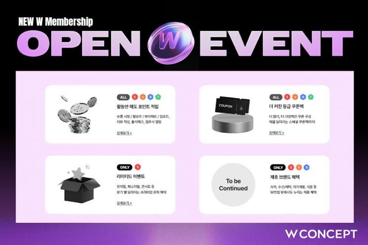 이달 말까지 고객 참여 이벤트도 진행한다. 이벤트 참여 시 멤버십 등급별로 1명씩 총 4명을 추첨해 W컨셉 앱에서 현금처럼 사용할 수 있는 500만 포인트를 각각 지급한다. 이외에도 멤버십 개편 알림 페이지에만 방문해도 받을 수 있는 최대 7% 시크릿 쿠폰을 발급한다.
