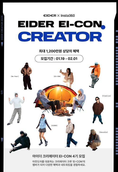 EI-CON 4기의 활동 기간은 3월부터 6월까지 총 4개월로 ‘아이더’의 2026년 봄여름 주력 제품을 활용해 매월 영상 1편과 이미지 콘텐츠 1건을 제작하게 된다. 활동 기간 동안 팀당 200만원 상당의 아이더 제품이 제공되며 매월 활동비 50만원이 지원된다. 활동 종료 후에는 어워즈를 통해 최대 750만원 규모의 상금도 수여될 예정이다. 이와 함께 발대식, 멘토링, 중간 교류 프로그램, 해단식 등 크리에이터 간 교류와 성장을 도모할 수 있는 다양한 네트워킹 프로그램도 운영한다.
