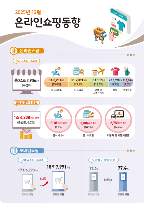 지난해 12월 한 달간 온라인쇼핑 거래액은 전년 동월 대비 6.2% 증가한 24조2,904억원, 모바일 쇼핑 거래액은 18조7,991억원으로 각각 집계됐다.