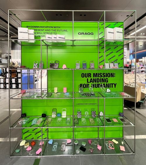 ‘그래그’는 이번 공간을 통해 네온 그린 컬러와 메탈 구조를 결합한 미래적인 테크 무드를 구현했다. 전시 오브제를 연상시키는 공간 연출로 브랜드 아이덴티티를 직관적으로 전달하며 입구에는 로고와 현수막을 강조해 시선을 집중시킨다. 또한 큐브형 선반을 활용해 제품을 패턴처럼 배치함으로써 시각적 즐거움을 극대화했다. 특히 SNS 업로드를 유도하는 구조로 기획되어 방문객들에게 새로운 경험을 제공할 예정이다.