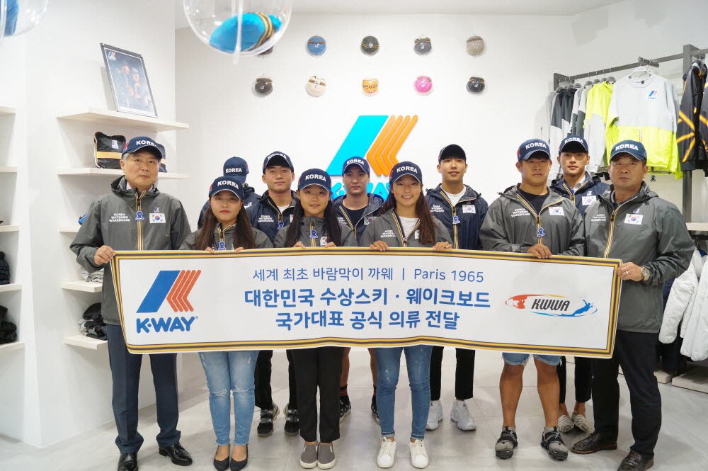 이들에게 제공되는 ‘까웨’의 대표 방수 바람막이 LE VRAI 3.0 CLAUDE와 수상스키 웨이크보드 대표팀 한정 티셔츠와 반바지를 착용하고 전달식에 참여했다.