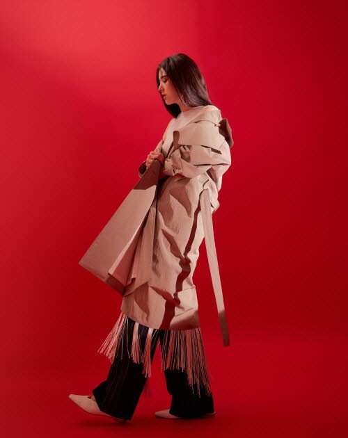 파우더리(Powdery)한 텍스쳐의 느낌을 살린 트렌치코트도 출시했는데 트렌치코트 아래로 화려한 샹들리에처럼 유려하게 흔들리는 프린지(Fringe ;숄이나 스카프의 가장자리에 붙이는 술 장식) 디테일을 레이어링해 실험적이고 모던한 스타일을 선보였다.