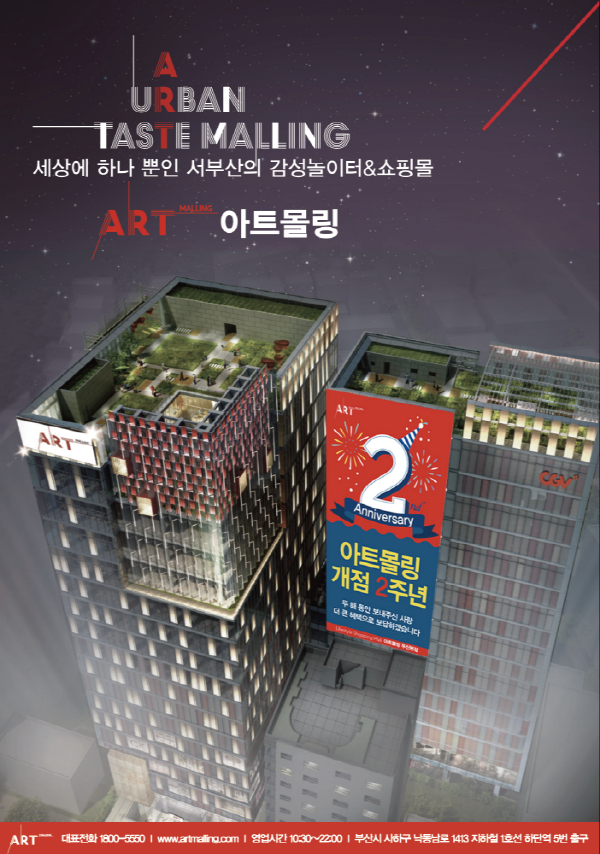 아트몰링 부산본점에는 상반기 대형서점 ‘영풍문고’와 슈즈편집숍 ‘ABC마트’가 입점할 예정이고 지방 최초로 신세계 이마트가 만든 만물상 ‘삐에로쑈핑’이 오는 5월 입점을 확정했다. 또한 서울 홍대 맛집을 한데 모은 셀렉다이닝 ‘빌앤쿡’이 입점하는 등 주요 앵커 테넌트(Anchor Tenant) 유치에도 성공했다.