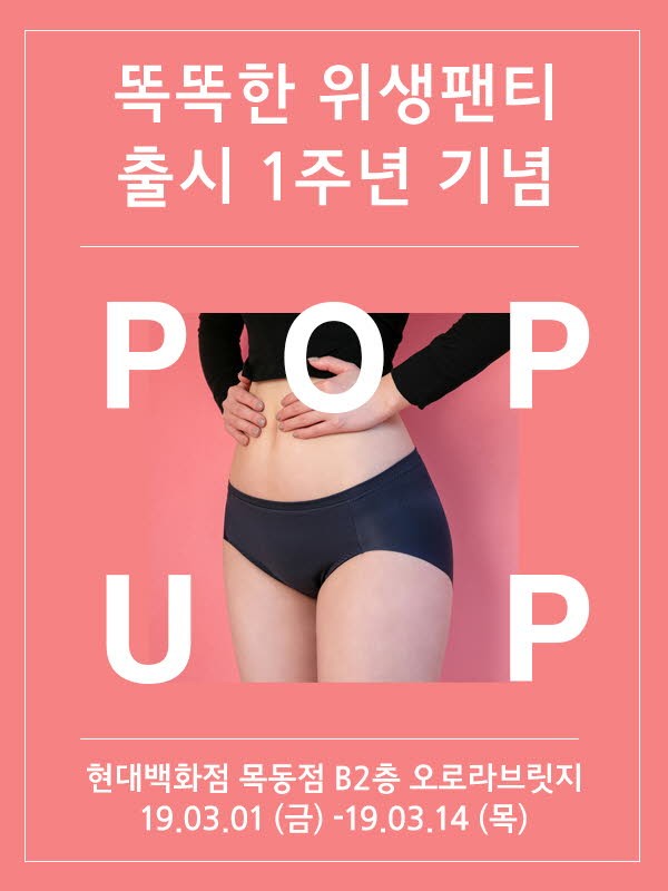 똑똑한 팝업스토어는 3월 1일부터 3월 14일까지 현대 유플렉스 목동점 지하 2층에 위치하며 현장 방문객에게는 똑똑한 위생팬티 2장 이상 구매 시 15%할인 및 3+1 프로모션 등 푸짐한 혜택을 제공하며 주말에는 모녀 고객 대상 10% 할인 이벤트도 진행된다.