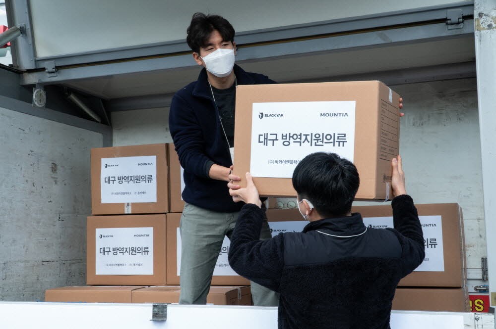 비와이엔블랙야크(회장 강태선)와 동진레저가 지난 27일 코로나19 방역을 위해 사투를 벌이고 있는 대구경북지역 의료인 및 방역 요원들을 위해 의류 1,000점을 전달했다.