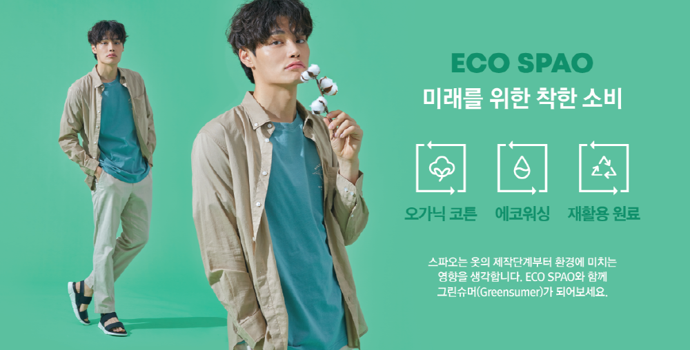이번 에코 캠페인은 지구의 날 50주년과 스파오 에코 라인 론칭을 기념해 진행되는 것으로 ‘스파오’의 에코라인은 에코워싱, 오가닉코튼, 리사이클 등 총 세 가지 라인으로 구성되어 있다.