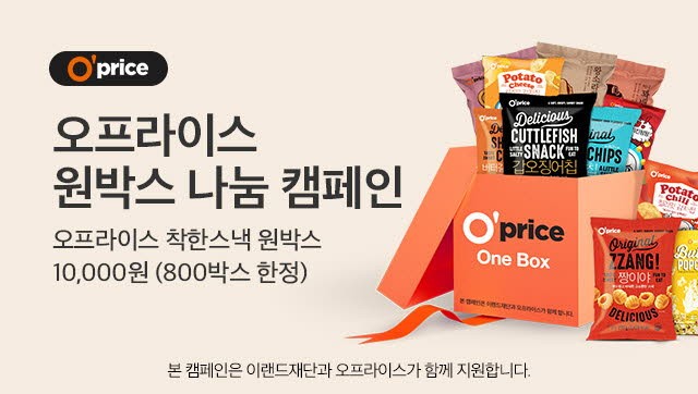 이랜드재단과 킴스클럽 PB 오프라이스가 오는 27일부터 진행하는 원박스 나눔캠페인은 고객이 오프라이스 스낵박스를 구입하면 2박스가 판매될 때마다 1박스를 저소득층 아동 및 그룹홈(공동생활가정) 아동에게 전달하는 사회공헌 캠페인이다.