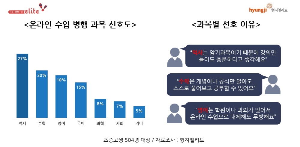 청소년들은 온라인 수업과 병행해도 문제없는 과목으로 역사를 꼽았으며 그 이유로 암기할 내용이 많은 과목 특성상 온라인 강의만으로 진행해도 충분하다는 의견이 많았다.