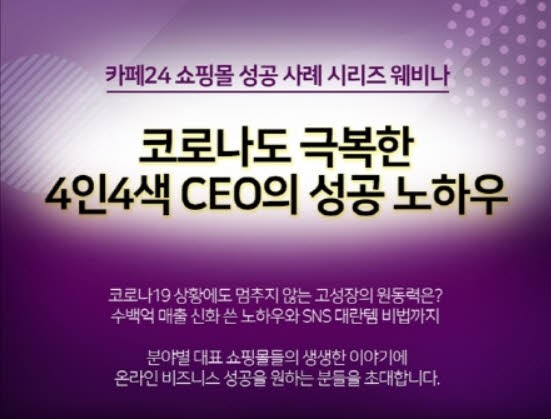카페24(대표 이재석)가 오는 15일과 22일 양일간 ‘카페24 쇼핑몰 성공 사례 시리즈’를 주제로 웨비나를 개최한다.