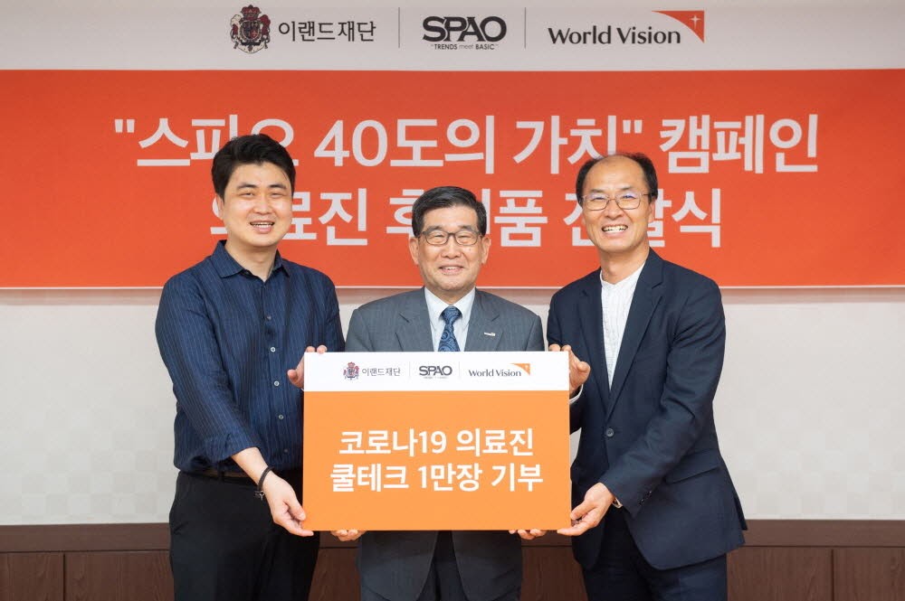 ‘스파오’와 이랜드재단은 지난 10일 월드비전 본사에서 이랜드월드 최운식 대표이사, 이랜드재단 정재철 대표이사, 월드비전 양호승 회장이 참석한 가운데 월드비전에 쿨테크 1만장(약 1억원 상당)을 전달했다.
