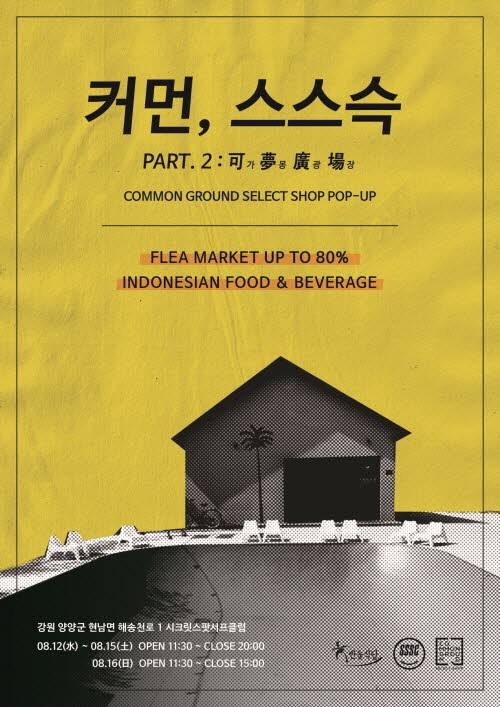 코오롱인더스트리 FnC부문(COO 이규호)이 8월 12일부터 16일까지 양양 인구 해변에 위치한 시크릿 스팟 서프 클럽에서 커먼그라운드의 팝업스토어 ‘커먼, 스스슥 마켓’를 운영한다.