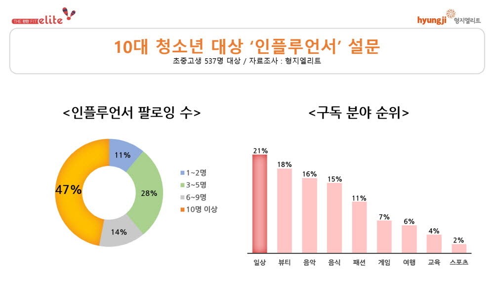 형지엘리트(대표 최병오)가 최근 10대 청소년을 대상으로 인플루언서 콘텐츠 소비 현황과 콘텐츠 내 특정 브랜드 인식에 관한 설문을 진행했다. 설문 결과 청소년의 절반 가량이 10명 이상의 인플루언서를 팔로링하며 주로 유튜브 채널을 방문하고 일상생활, 뷰티, 음악, 음식, 패션분야의 콘텐츠를 챙겨보는 것으로 나타났다.