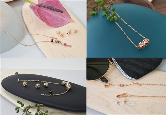 별, 스퀘어 큐빅, 하트, 클로버, 열쇠 등 다양한 문양의 참(Charm)으로 기본형의 팔찌와 목걸이로 연출할 수 있으며 세트로 구성된 연결고리와 부속장식을 활용하면 드레시한 롱 목걸이 외 Y형 목걸이, 귀걸이, 패션 마스크 줄과 안경 줄까지 총 7가지 스타일로 변형이 가능하다.