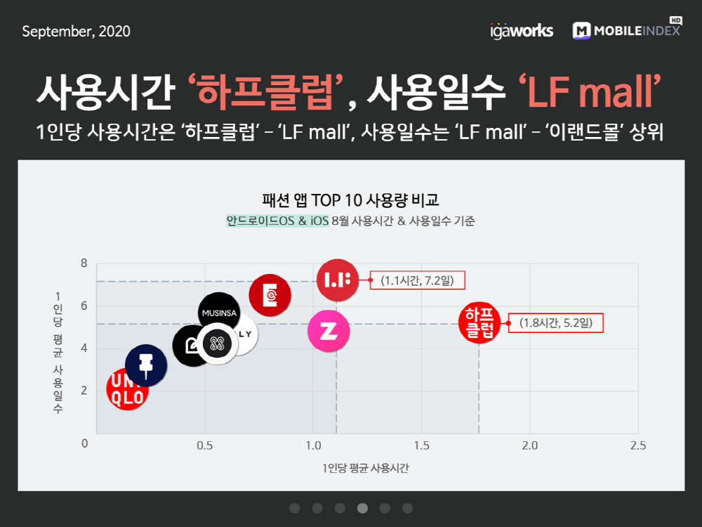 모바일 빅데이터 플랫폼 기업 아이지에이웍스가 데이터분석 솔루션 모바일인덱스를 통해 안드로이드와 아이폰 이용자를 분석한 국내 패션 앱 사용자 현황을 발표했다. 지난 8월을 기준으로 하프클럽을 이용하는 고객들의 월평균 사용시간이 1.8시간으로 가장 길었다.