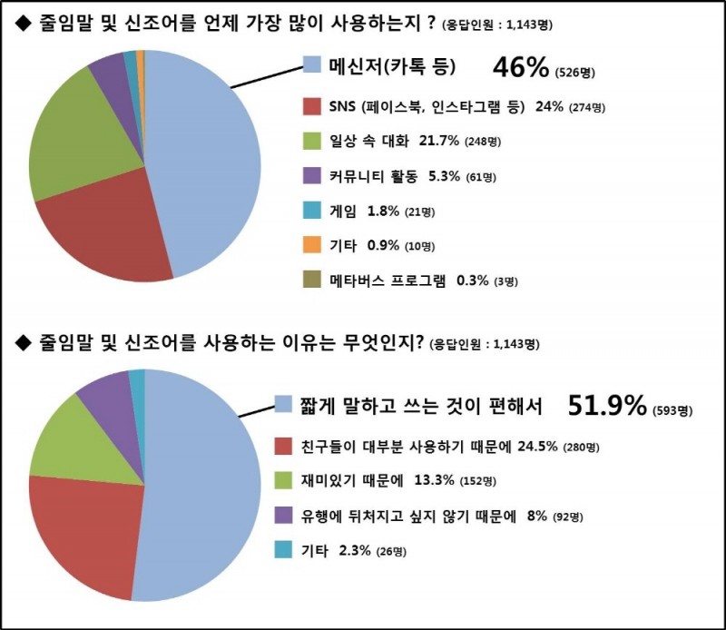 ‘줄임말 및 신조어를 언제 가장 많이 사용하는지’에 대한 질문에는 ▲메신저(카톡 등)(46%, 526명), ▲SNS(페이스북, 인스타그램 등)(24%, 274명), ▲일상생활 속 대화(21.7%, 248명), ▲커뮤니티 활동(5.3%, 61명), ▲게임(1.8%, 21명), ▲기타(0.9%, 10명), ▲메타버스 프로그램(0.3%, 3명)이라고 응답했다.