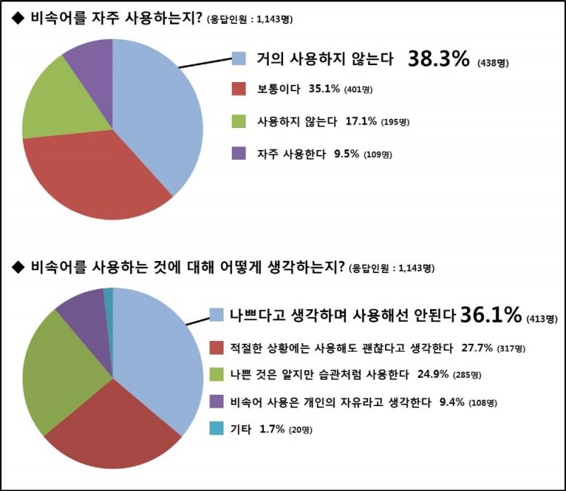‘비속어를 사용하는 것에 대해 어떻게 생각하는지‘에 대한 질문에는 ▲비속어를 사용하는 것은 나쁘기 때문에 사용해선 안된다(36.1%, 413명), ▲적절한 상황에는 사용해도 괜찮다고 생각한다(27.7%, 317명), ▲비속어 사용이 나쁜 것은 알지만 습관처럼 사용한다(24.9%, 285명), ▲비속어 사용은 개인의 자유라고 생각한다(9.4%, 108명) ▲기타(1.7%, 20명)라고 응답했다.