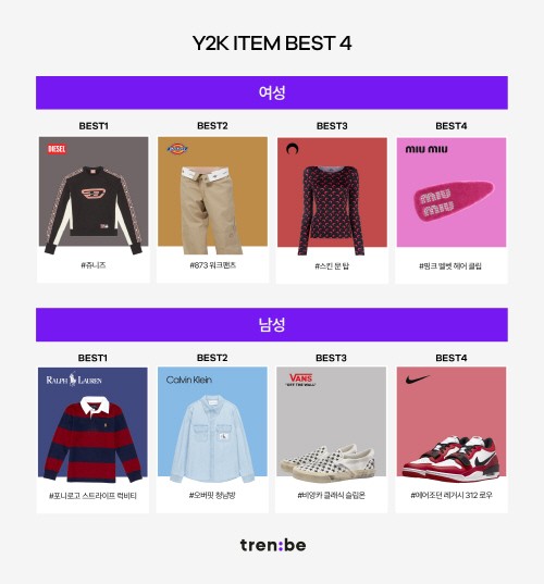 이에 트렌비는 MZ세대들이 Y2K패션을 가장 잘 표현할 수 있는 제품을 선별해 Y2K ITEM BEST 4를 발표했다. 여성 아이템으로는 ‘디젤’ 스웨트셔츠, ‘디키즈’ 워크팬츠, ‘마린세르’ 스킨 티셔츠, ‘미우미우’ 헤어클립이 선정되었으며 남성 아이템으로는 ‘폴로랄프로렌’ 럭비 티셔츠, ‘캘빈클라인’ 데님 셔츠, ‘반스’ 슬립온, ‘나이키’ 조던 레트로가 선정되었다.