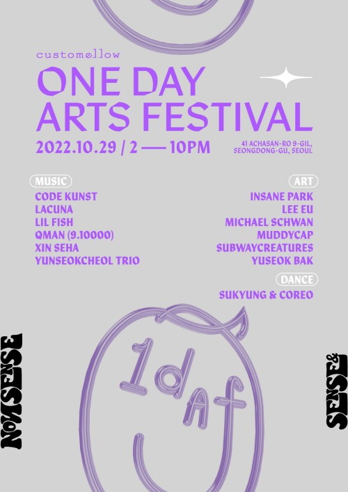 ‘커스텀멜로우’의 이번 시즌 엠버서더인 프로듀서 코드 쿤스트도 이번 1DAF:원데이아츠페스티벌의 아티스트로 참여한다. 또한 밴드 라쿠나, 구만, 릴피쉬, 신세하, 윤석철 트리오, 무용가 유수경 & COREO에 이르기까지 콘서트와 댄스 퍼포먼스까지 즐길 수 있도록 다채로운 프로그램을 제공한다