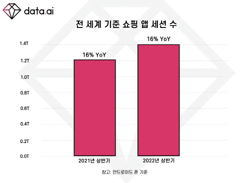 data.ai의 데이터 따르면 올해 상반기 전 세계 소비자는 쇼핑 앱에 1.4조번 방문한 것으로 나타났다. 이는 2021년 상반기(1.2조 세션) 대비 16% 증가한 수치로 2020년 대비 2021년 성장세 역시 16%였다는 점을 감안하면 경기 침체 속에서도 쇼핑 앱 내 소비자 참여도는 꾸준히 증가하고 있다는 점을 시사한다.