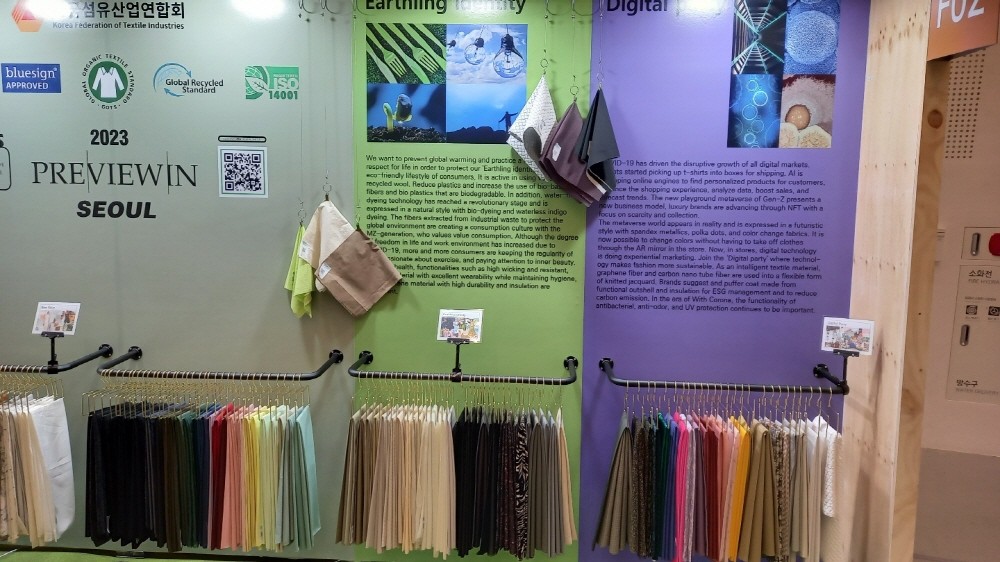 특히 트레이드쇼 참가 브랜드 중 지속가능 패션을 추구하는 나빔, 메종니카, 홀리넘버세븐 등은 옥수수 원료 생분해 소재, 한지 레더, 리사이클 데님 등과 소량 오더가 가능한 최신 개발 친환경 소재에 많은 관심을 보였다.