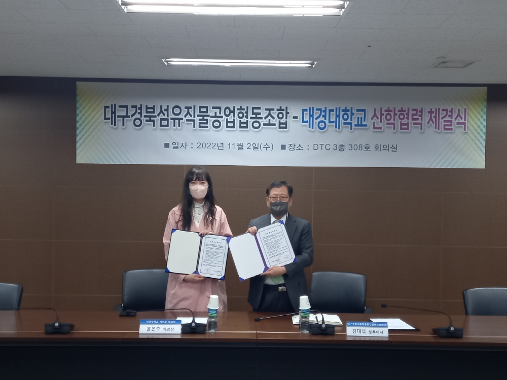 대구경북섬유직물공업협동조합(이사장 이석기)가 대경대학교(총장 이채영)와 지난 11월 2일 대구텍스타일콤플렉스에서 산학협력 업무협약을 체결했다.
